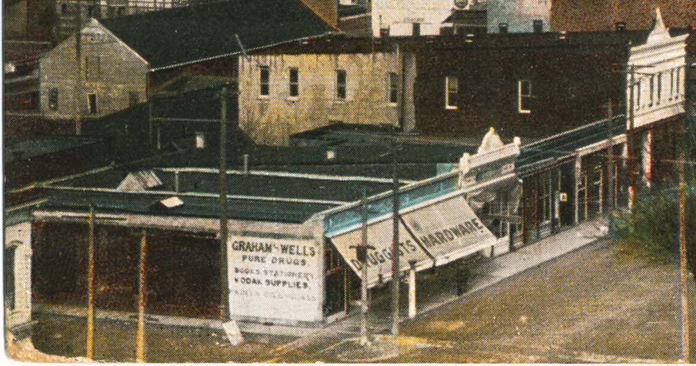 | 1915 Graham And Wells; now Albright And Raw. You'd be standing on the roof of the Post Office looking NW across the intersection of Jefferson and 2nd St. This is now a bank parking lot. The building north of the Hardware awning was Gerdings Grocery Store. This was in business until the 1960's. |